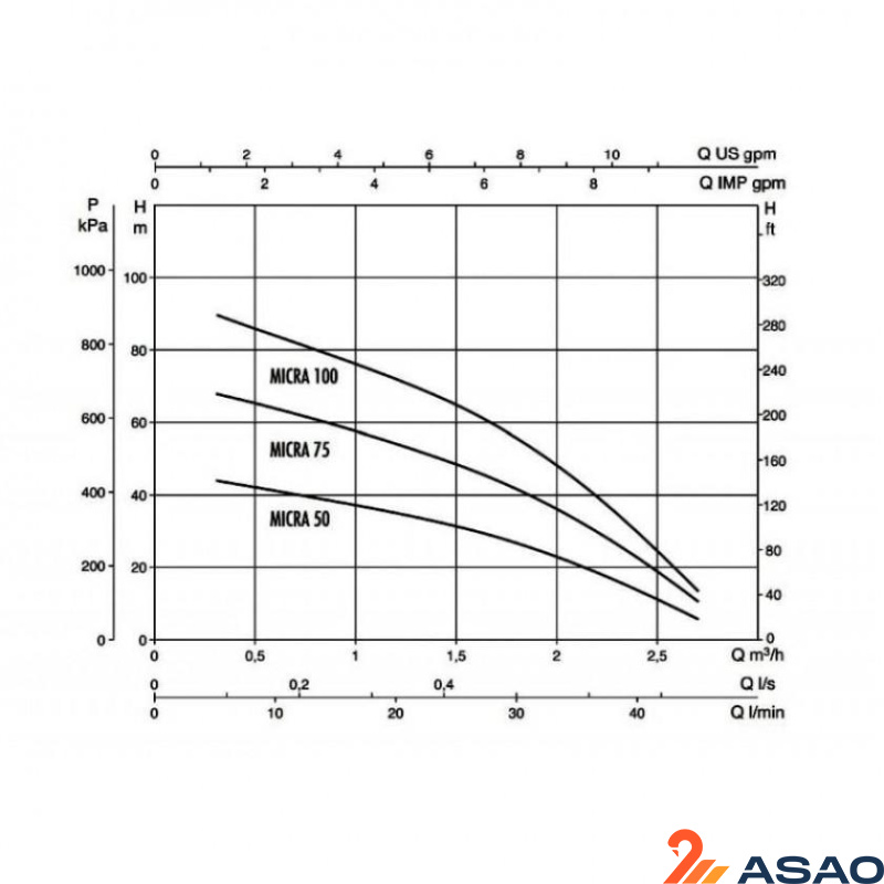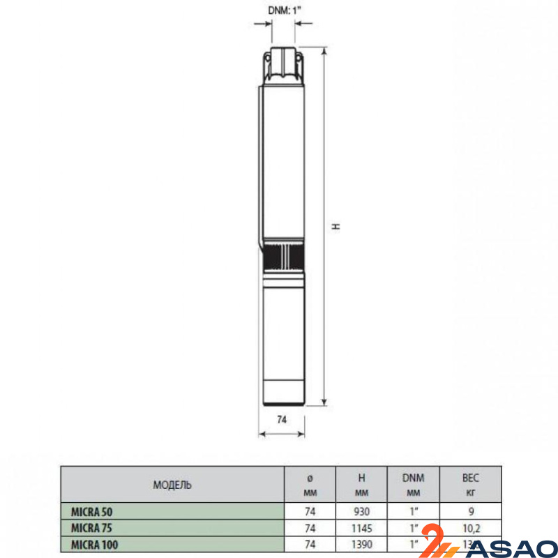 Насос MICRA 50 M разработан специально для индивидуальных и коллективных систем водоснабжения. Для скважин диаметром 3" и более. Рабочий диапазон: производительность – от 0,3 до 2,7 куб.м/ч, напор – до 90 м. водяного столба . Максимальное рабочее давление: максимальная глубина погружения – 70 м. Перекачиваемая жидкость. Состав: чистая, без твердых включений и минеральных масел, не вязкая, химически нейтральная, по характеристикам аналогичная воде. Максимальное содержание песка в воде – 40 г/куб.м. Температура – от 0°С до +35°С. Основные материалы. Рабочие колеса, диффузоры и обратный клапан – из технополимера, основания двигателя и гидравлической части – из бронзы, кожух гидравлической части, кожух двигателя, валы, муфта и защитная крышка кабеля – из нержавеющей стали. Особенности. Многоступенчатый скважинный насос. Все двигатели оборудованы встроенной тепловой защитой с автоматическим перезапуском. Однофазные модели требуют доукомплектации устройством Control Box, в которое встроен конденсатор. Монтаж: Вал двигателя в вертикальном или горизонтальном положении. В случае горизонтального положения вала необходимо соблюсти требования по нагрузке подшипников и организовать поток жидкости для охлаждения двигателя. Комплект поставки: насос в сборе с кабелем длиной для модели Micra 50 – 1 м., Micra 75 – 1,2 м., Micra 100 – 1,4 м. Стандартное электропитание: 1x230 В, 3x400 В. Степень защиты: IP 68. Класс изоляции: F.