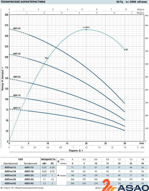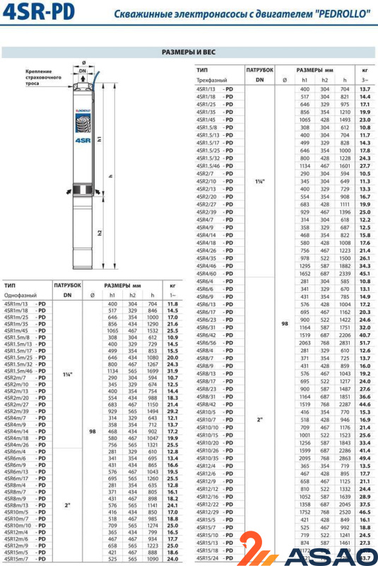 Основные технические характеристики скважинных насосов серии Pedrollo 4SR1: