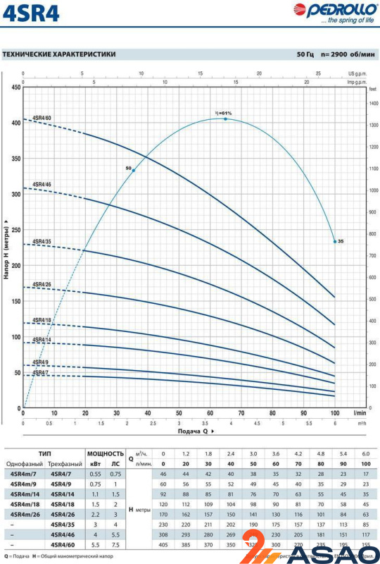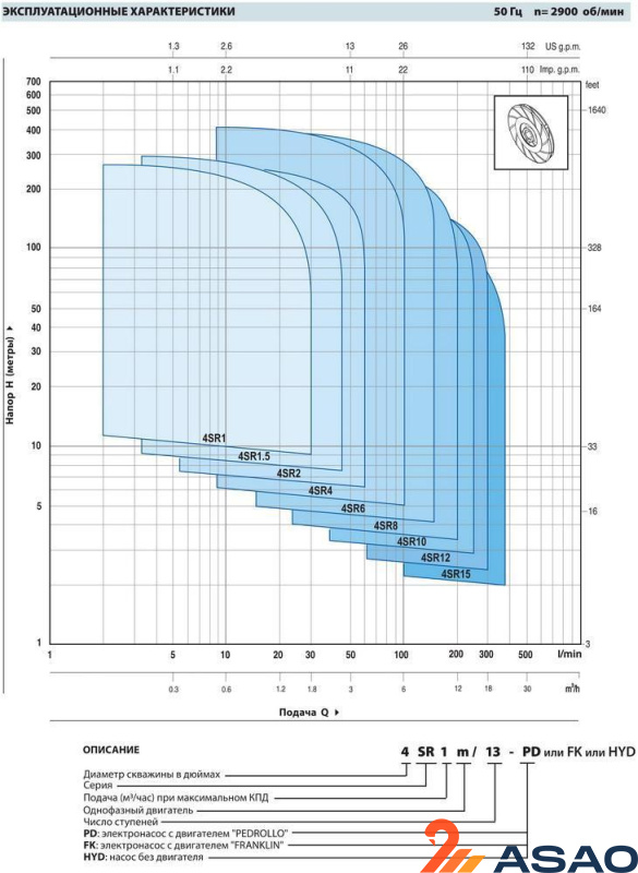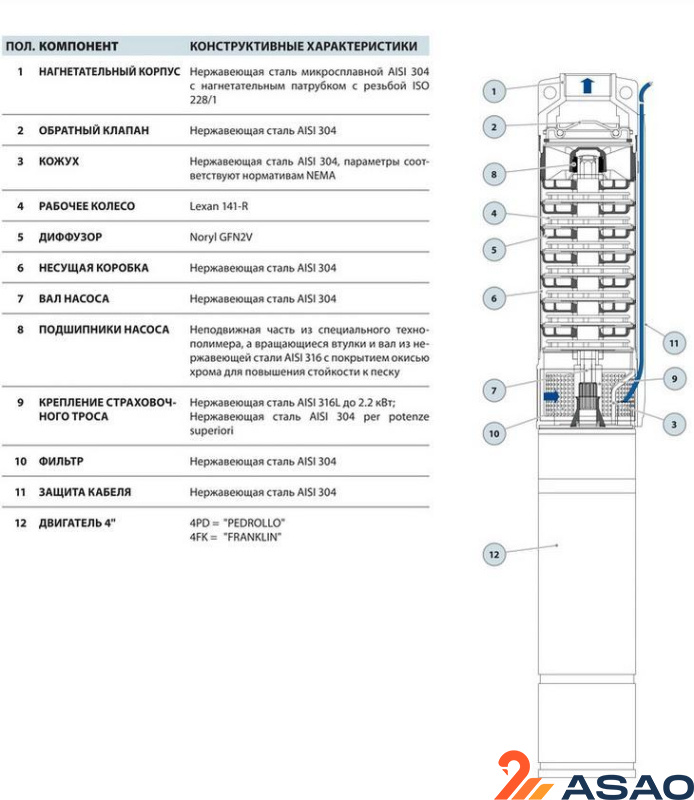 Серия насосов 4SR4 включает в себя МНОГОСТУПЕНЧАТЫЕ ЭЛЕКТРОНАСОСЫ ЦЕНТРОБЕЖНОГО ТИПА, предназначенные для постоянного функционирования в погруженном состоянии. Двигатель подключается к насосу через суппорт, параметры которого соответствуют нормативам NEMA. Принцип функционирования аналогичен принципу функционирования многоступенчатых центробежных насосов. Рабочие колеса, установленные на одном и том же ведущем валу, вращаются внутри лопаточных диффузоров, которые обеспечивают движение жидкости на выходе каждого рабочего колеса по направлению к всасывающему патрубку следующего рабочего колеса. После прохождения через все рабочие колеса, установленные последовательно, жидкость покидает насос через нагнетательный патрубок. Каждое рабочее колесо с соответствующим лопаточным диффузором создают ступень нагнетания, которая, согласно принципу функционирования центробежных насосов, обеспечивает для жидкости перепад давления, который суммируется с перепадами, создаваемыми другими последовательными ступенями.