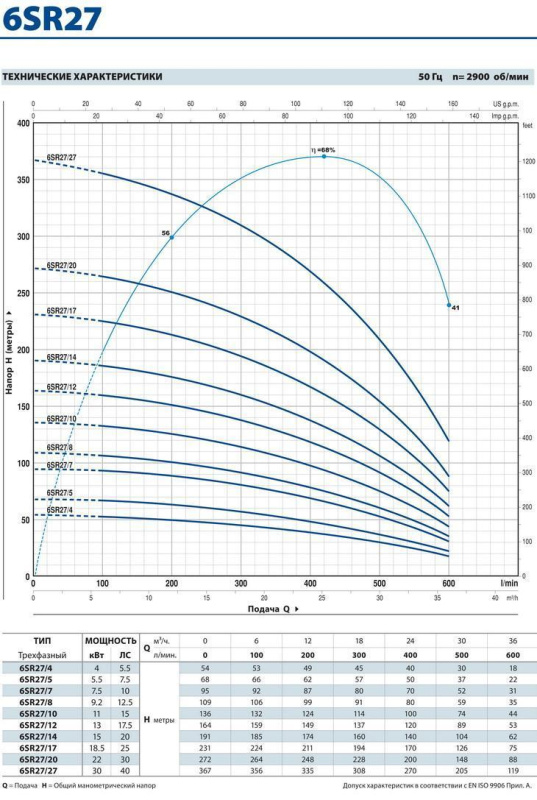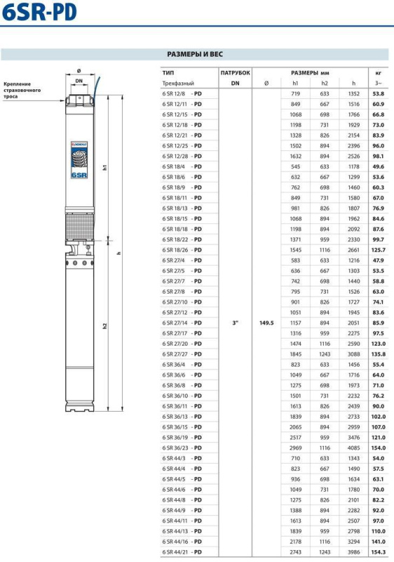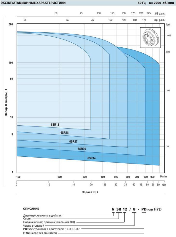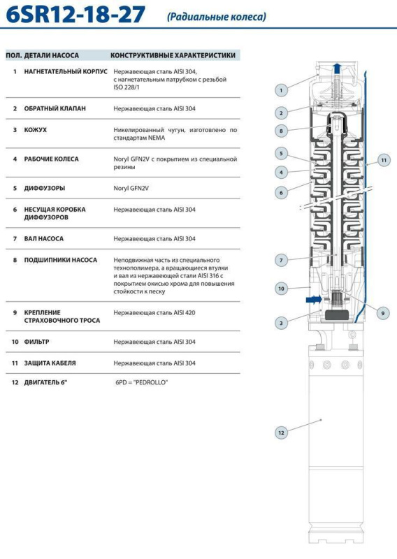 Серия 6SR27 включает в себя многоступенчатые электронасосы центробежного типа, предназначенные для постоянного функционирования в погруженном состоянии. Двигатель подключается к насосу через суппорт, параметры которого соответствуют нормативам NEMA. Принцип функционирования аналогичен принципу функционирования многоступенчатых центробежных насосов. Рабочие колеса, установленные на одном и том же ведущем валу, вращаются внутри лопаточных диффузоров, которые обеспечивают движение жидкости на выходе каждого рабочего колеса по направлению к всасывающему патрубку следующего рабочего колеса. После прохождения через все рабочие колеса, установленные последовательно, жидкость покидает насос через нагнетательный патрубок. Каждое колесо с соответствующим лопаточным диффузором создают ступень нагнетания, которая, согласно принципу функционирования центробежных насосов, обеспечивает жидкости для перепада давления, который суммируется с перепадами, создаваемыми другими последовательными ступенями.