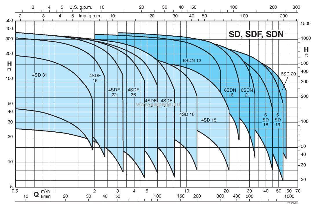 Насос Calpeda 6SD 19/4 относится к погружным скважинным насосам и имеет высокую производительность вследствие использования современных технологий. Полностью соответствует международным стандартам качества. Одна из главных отличительных особенностей - высокая надежность. Насос Calpeda 6SD 19/4 оснащен внешним наружным кожухом из нержавеющей стали (AISI 304), вал из хромоникелевомолибденивой стали (AISI 316), что позволяет использовать оборудование в глубоких скважинах. Обратный клапан встроен в раструб подающей части. Помимо этого, насос имеет компактную конструкцию и обладает удобством эксплуатации. Подходит для использования в различных отраслях и сферах: промышленные и бытовые объекты, обеспечение ирригации в сельском хозяйстве, сфере ЖКХ и строительстве, могут быть использованы в качестве оборудования для противопожарных систем. Кроме того, может быть использован в открытой воде в горизонтальном и вертикальном положении при наличии дополнительной рубашки охлаждения. Возможны исполнения с двигателями для скважин с повышенным температурным режимом, а также с другими напряжениями и частотой 60 Гц. Насос может перекачивать чистые и низкозагрязненные жидкости с некоторым содержанием твердых частиц. Двигатель предрасположен для работы с инвертором. Мощность насоса Calpeda 6SD 19/4 составляет 7.5 кВт, а напряжение — 380В В. Насос обеспечивает напор от 12 до 60 м, производительность — от 6 до 54 м³/ч. Изоляция класса “F” для двигателей 4”, класса “Е” для двигателей 6”. Защита класса IP 68.Область применения